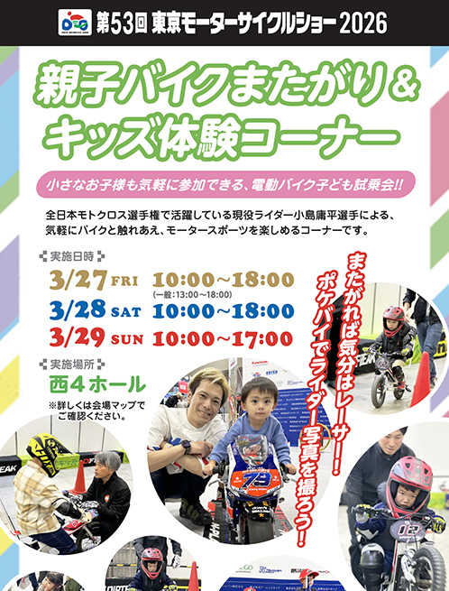 全日本モトクロス選手権で活躍している現役ライダー小島庸平選手による、気軽にバイクと触れあえ、モータースポーツを楽しめるコーナーです。