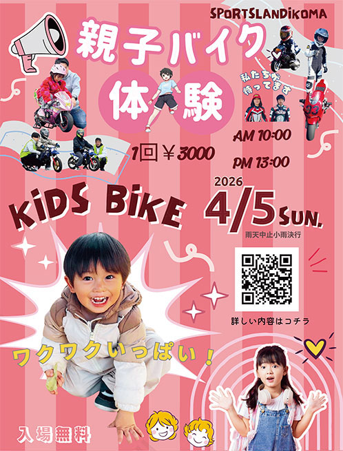 当日はエンジンを始動せず、ポケバイにまたがり足で地面をこいで進む体験形式になります。